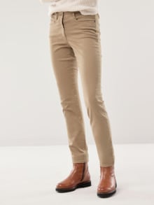 Mit Comfort-Bund (ca. 6 cm dehnbar). Five-Pocket-Form. 2 Stecktaschen, 1 Münztasche, 2 aufgesetzte Gesäßtaschen. Mit Formsattel. Fußweite ca. 35 cm. Innenbeinlänge ca. 77 cm in Gr. 42, ca. 72 cm in K-Gr. 21, ca. 82 cm in L-Gr. 84. Ohne Gürtel.